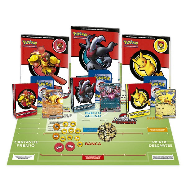 POKEMON ACADEMIA DE COMBATE 2024. 3 Barajas de cartas de 60. 2 guías de juego 1 hoja de reglas 1 tapete 1 moneda 1 hoja de Contador de daño 3 cajas 1 hoja de instrucciones 1 Código de descarga