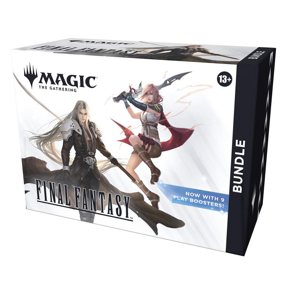 CONTENIDO DEL BUNDLE: 9 sobres de juego de Magic: The Gathering—FINAL FANTASY, 2 cartas foil tradicionales con arte extendido, 32 cartas de tierra con arte completo (16 foil, 16 no foil), 1 contador de vidas Spindown, 1 caja guardacartas y 2 tarjetas de referencia