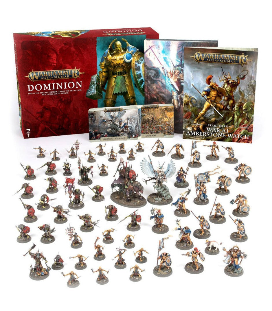 Dominion, viene con dos ejércitos completos, cada uno con sus unidades propias y un líder que los va a guiar durante la batalla. Además, en su interior también tendremos el Libro de Reglas, las Warscroll y material de referencia. Uno de los ejércitos que viene en la caja son los Stormcast Eternas, un total de 21 miniaturas que se enfrentarán a los Kruleboyz son una nueva raza de orruk que abunda mucho en los Reinos Mortales, tanto es así que vienen un total de 39 miniaturas.