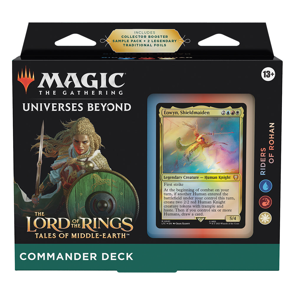 CONTENIDO: 1 mazo de Commander de El Señor de los Anillos: relatos de la Tierra Media listo para jugar (incluye 2 cartas legendarias foil), un sobre de coleccionista con 2 cartas de muestra, 1 comandante foil grabado especial, 10 fichas de dos caras, 1 carta de ayuda, 1 contador de vidas y 1 caja guardamazo