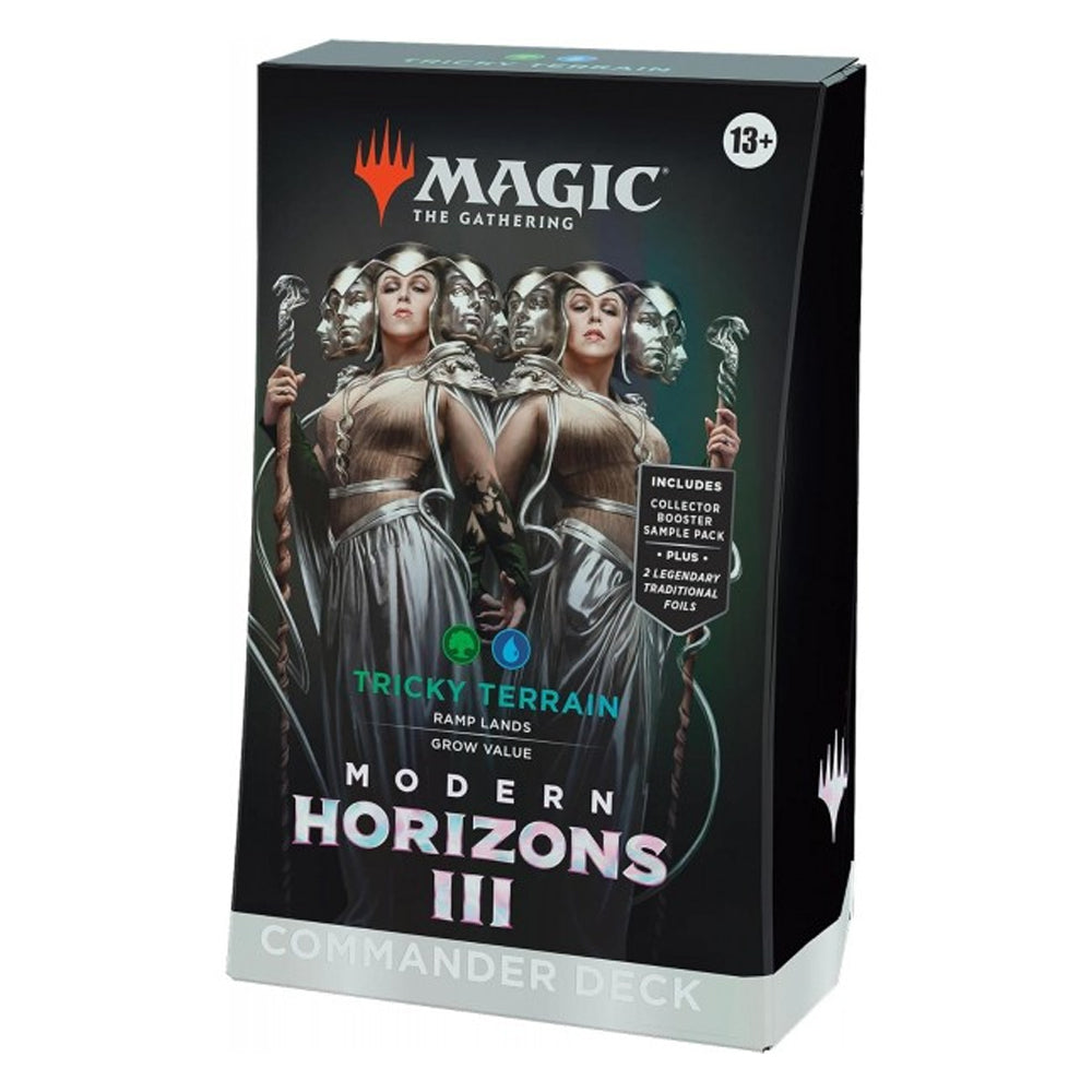 El mazo Commander Tricky Terrain de Modern Horizons 3 para Magic: The Gathering, en inglés, está diseñado para jugadores expertos que buscan dominar el terreno de juego con estrategias tácticas y versátiles. Este mazo combina cartas que manipulan el campo y aprovechan interacciones complejas para controlar la partida y sorprender al oponente. Ideal para quienes desean un enfoque estratégico avanzado en el formato Commander.