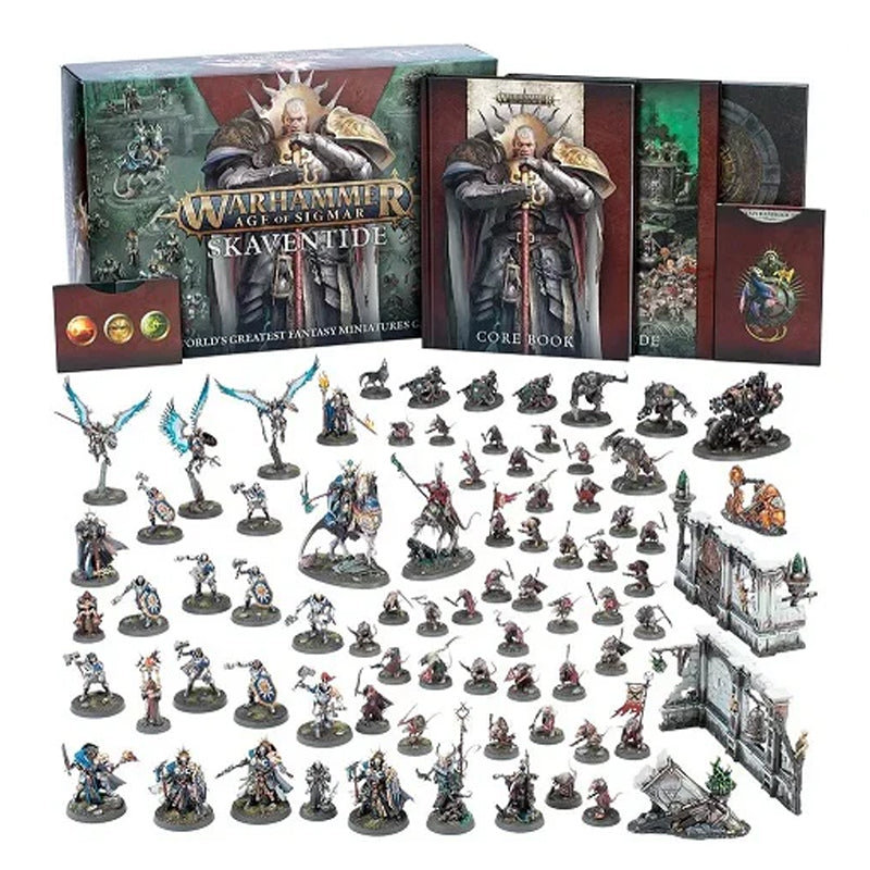 This massive launch box is packed to the brim with 74 jaw-dropping new miniatures divided between two factions. The Stormcast Eternals comprise 24 miniatures, with a command staff made up of an imperious Lord-Vigilant on Gryph-Staker, a solemn Lord-Terminos with attendant Memorian, a Lord-Veritant with Gryph-crow, and a Knight-Questor. The rank and file are made up of 10 indomitable Liberators , alongside three battle-hardened Reclusians with their Memorians and three soaring Prosecutors. Pitted against them are the perfidious Skaven. They are led by a scheming Claw-lord on Gnaw-Beast and a Grey Seer from the Masterclan, while a Warlock Engineer watches over the complement of Skryre weapons. The crowning jewel of this collection of chaotic contraptions is the Ratling Warpblaster, which is supported by three Warplock Jezzails. A truly prodigious collection of 40 Clanrats make up the bulk of this vile horde, and three hulking Rat Ogres provide the muscle. That’s not everything either, as Skaventide also comes with everything you need to play the new Spearhead game mode. Within the Stormcast Eternals and Skaven forces there are enough miniatures to construct their Spearhead forces, and rules for all of the currently available Spearhead boxes are contained within the 144-page Spearhead: Fire and Jade book. On top of that, you’ll get a double-sided game board with printed objectives, the four pieces of terrain you need, 3” and 6” range rulers which clip together, and all the cards you need – two Twist Decks and two Battle Tactic Decks. Miniatures require assembly & painting, glue & paints not supplied